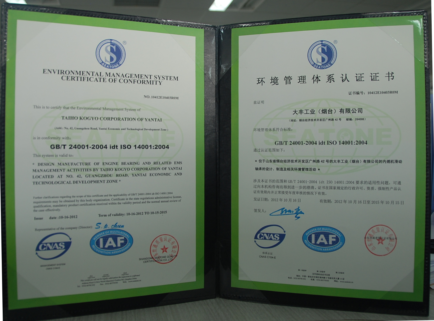 2012年9月13日,公司按照GB/T24001-2004idtISO14001:2004標準建立的環境管理體系,順利通過了山東青島世通質量認證有限公司組織的第三方環境管理體系認證審核。