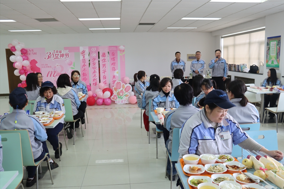 活動伊始,李第一副總經理代表公司致辭,充分肯定女職工在崗位上的卓越貢獻,并強調將持續優化關愛舉措。毛工會主席為每位女職工送上節日的祝福,現場洋溢著歡聲笑語。管理部炊事班大顯身手,推出芥末大蝦、魚籽雞翅等創意佳肴,搭配“女神專屬”奶油蛋糕,讓女職工們盡享味蕾盛宴。